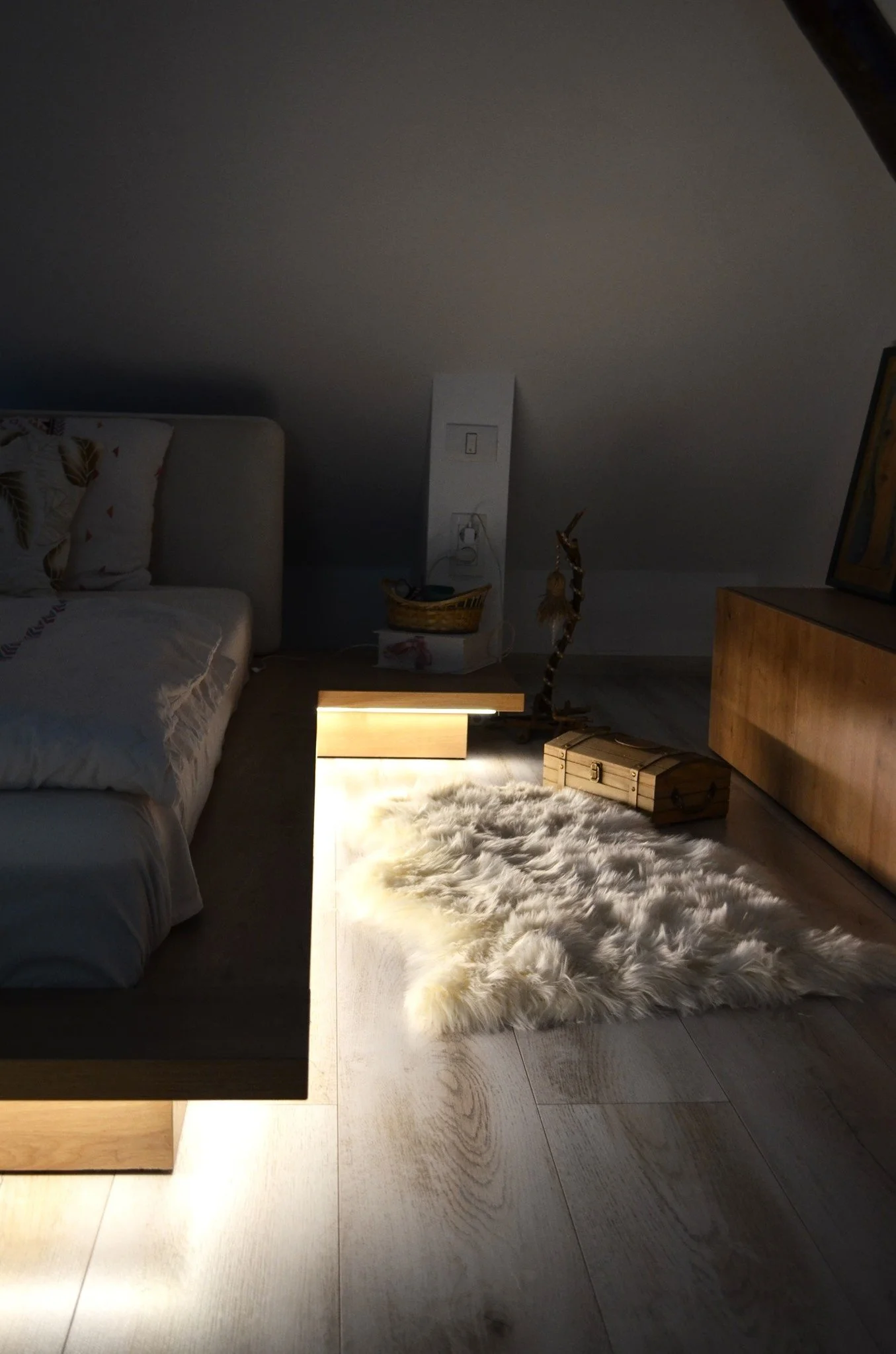 Structura acoperișului și grinzile expuse definesc atmosfera, iar iluminarea caldă, completată de benzi LED, conturează un ambient plăcut, ușor de adaptat în funcție de moment.